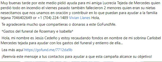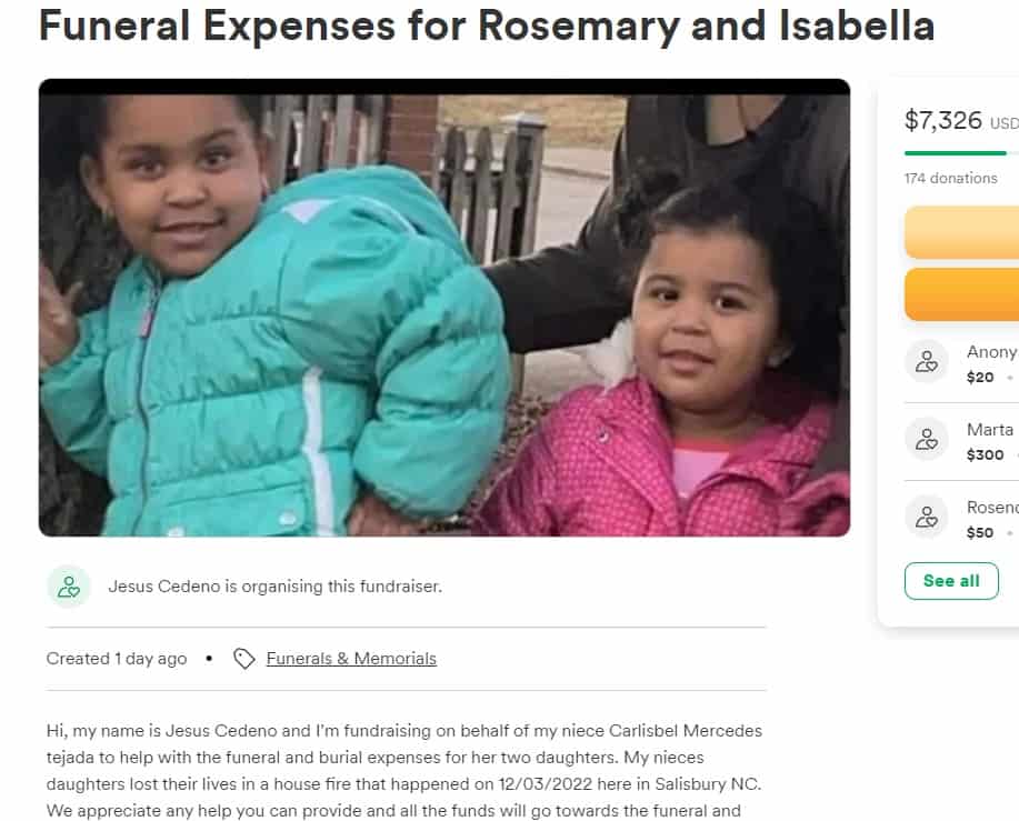 “Hola, mi nombre es Jesús Cedeño y estoy recaudando fondos en nombre de mi sobrina Carlisbel Mercedes tejada para ayudar con los gastos del funeral y entierro de sus dos hijas. Las hijas de mis sobrinas perdieron la vida en un incendio en una casa que ocurrió el 03/12/2022 aquí en Salisbury NC.”, versa el texto de la campaña.