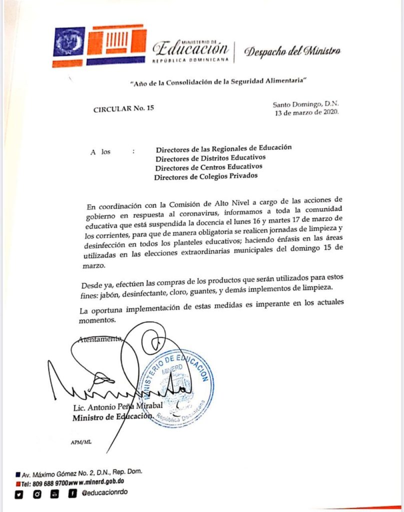 SANTO DOMINGO. –El ministro de Educación, Antonio Peña Mirabal, anunció este viernes la suspensión de la docencia los dos días siguientes de las elecciones de este domingo 15 de marzo, con la finalidad de higienizar los centros educativos donde funcionaran algunos colegios electorales y así evitar el contagio del coronavirus.