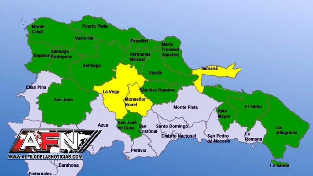 Del total de provincias en alerta, tres están en alerta amarilla y 16 en verde. Las provincias en alerta amarilla son: La Vega, Monseñor Nouel y Samaná.