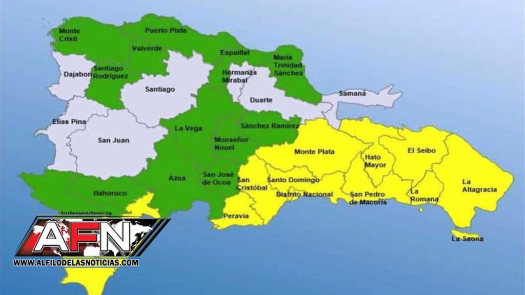 Por otro lado, las provincias en alerta verde son: Independencia, La Vega, Monseñor Nouel, San José de Ocoa, María Trinidad Sánchez, Azua, Bahoruco, Sánchez Ramírez, Valverde, Santiago Rodríguez, Puerto Plata, Espaillat y Montecristi.