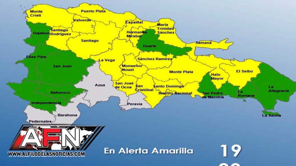Las provincias en alerta amarilla se concentran en el norte, noreste, centro y el Gran Santo Domingo, donde se prevé mayor acumulación de lluvias. En alerta verde se encuentran zonas del este y suroeste.