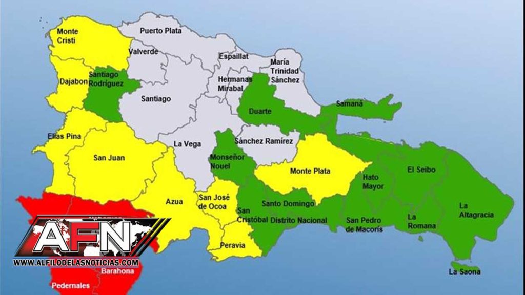 Las provincias que permanecen en alerta roja son Barahona, Pedernales, Independencia y Bahoruco; en amarilla, San José de Ocoa, Elías Piña, Dajabón, Azua, San Juan, Monte Plata, San Cristóbal y el Distrito Nacional; y en verde, Peravia, Monseñor Nouel, Duarte, La Altagracia, La Romana, El Seibo, Hato Mayor, Santiago Rodríguez, Montecristi, San Pedro de Macorís, Santo Domingo y Samaná.