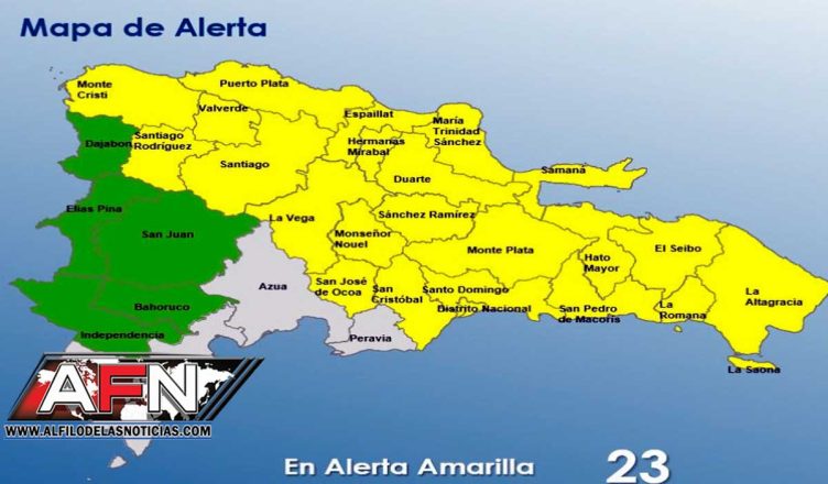 SANTO DOMINGO.– Un total de 28 provincias se encuentran en alerta meteorológica, 23 en amarilla, incluida el Distrito Nacional y cinco en verde.