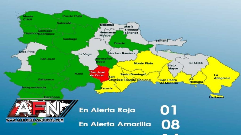El director del organismo, Juan Manuel Méndez, informó que San José de Ocoa se mantiene en alerta roja, mientras que las provincias Monte Plata, La Altagracia, Distrito Nacional, San Cristóbal, Peravia, La Romana, San Pedro de Macorís y Santo Domingo fueron elevadas a alerta amarilla.