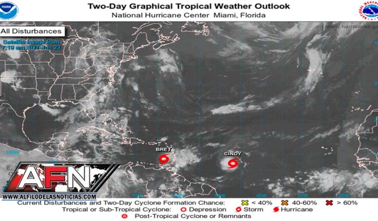 Mañana sábado, aunque se prevé que el centro de la tormenta tropical Bret no incidirá directamente sobre nuestro territorio, pasando a cientos de kilómetros al sur del país por aguas del mar Caribe, el amplio campo nuboso que le acompaña influirá sobre varias localidades ubicadas sobre todo en el litoral costero Caribeño, el noreste, Cordillera Central y la zona fronteriza, desde las horas matutinas provocando aguaceros dispersos, siendo fuertes en ocasiones, tormentas eléctricas y ráfagas de viento, especialmente en las provincias: La Altagracia, La Romana, Sánchez Ramírez, Monte Plata, San Pedro de Macorís, El Gran Santo Domingo, San Cristóbal, Peravia, Barahona, Monseñor Nouel, La Vega, Sánchez Ramírez, entre otras más cercanas a estas.