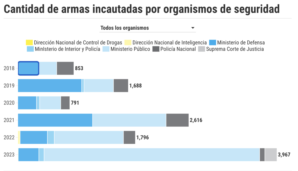 Pero no solo las armas potentes entran en cantidades que llaman la atención de las autoridades. Dominicanas. Solo en el 2022 los organismos de seguridad se incautaron de 1,796 armas de fuego y, hasta junio de este año, se suman otras 3,967, conforme las estadísticas disponibles en el portal Datos Abiertos, una plataforma oficial del Gobierno dominicano.