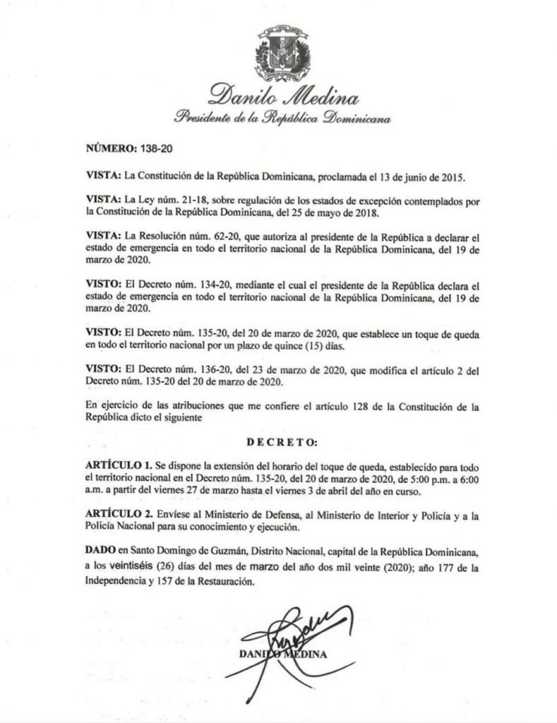 SANTO DOMINGO. – El presidente de la República, Danilo Medina, dispuso este jueves la extensión del toque de queda a partir de este viernes, por lo que la población deberá permanecer en sus hogares desde las 5:00 de la tarde, hasta las 6:00 de la mañana del día siguiente.