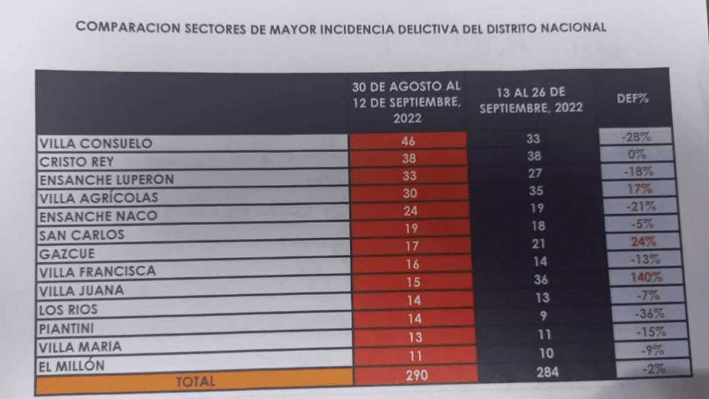 Anteriormente, desde 30 de agosto hasta el 12 de septiembre, el sector Villas Agrícolas registraba 30 casos y aumentó a 35, por lo que en su informe, la Policía Nacional indicó que con los cinco casos más se registra una crecimiento de un 17 % en los actos delictivos. En Gascue había 17 y ahora 21, mientras que en Villa Juana eran 15 y actualmente son 36.