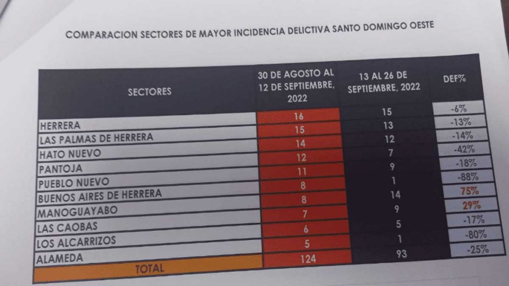 En Santo Domingo Oeste la relación de estas incidencias indica que dos sectores de la zona aumentaron los actos delictivos entre 75 y 29 % respectivamente al comparar los registros de casos anteriores.