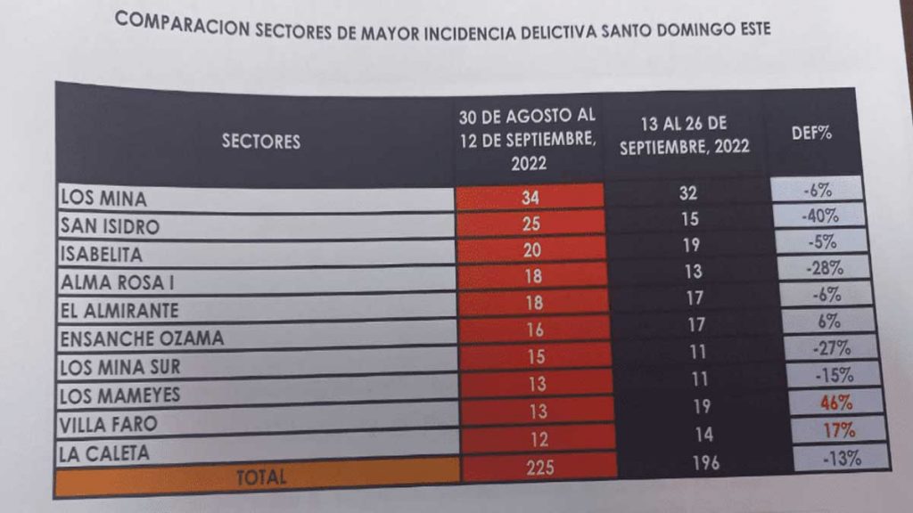 El análisis de las autoridades fue realizado desde 30 de agosto hasta el 26 de septiembre del año en curso, donde indica que desde el 13 hasta el 26 de septiembre los actos delictivos en tres sectores del Distrito Nacional aumentaron entre un 17, 24 y 140 % respectivamente al compararlo con los datos registrados anteriormente en igual cantidad de días.