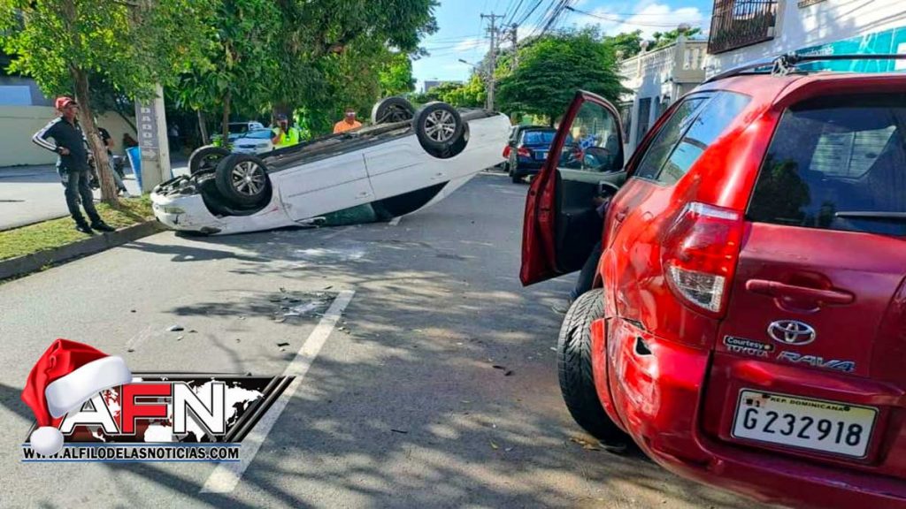De acuerdo a testigos, el conductor de un carro Toyota Camry, blanco, supuestamente en estado de ebriedad, perdió el control del vehículo, chocó una yipeta Toyota Rav4, roja que estaba estacionada y luego se volcó atravesando la vía.