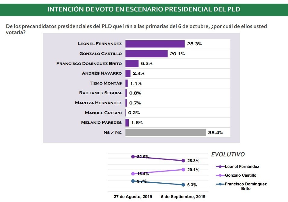 Sobre la intención del voto entre los precandidatos del PLD en las primarias para las presidenciales, Leonel Fernández aventaja con un 28.3%, seguido de Gonzalo con un 20.1%, Domínguez Brito 6.3% y Navarro 2.4%, entre otros con mejor porcentaje.