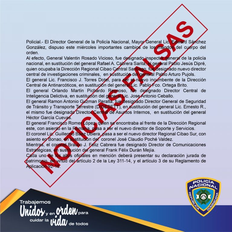SANTO DOMINGO.- Es falsa la información que circula en las redes sociales de que el Director General de la Policía Nacional, mayor general Edward Sánchez González, habría dispuesto este miércoles importantes cambios de los mandos del cuerpo del orden, incluyendo al Director General de Seguridad de Tránsito y Transporte Terrestre (Digesett), donde, según la nota, designaba al general Ramón Antonio Guzmán, quien fue implicado en supuesto sabotaje ocurrido en las suspendidas elecciones municipales del 15 de febrero de este año.