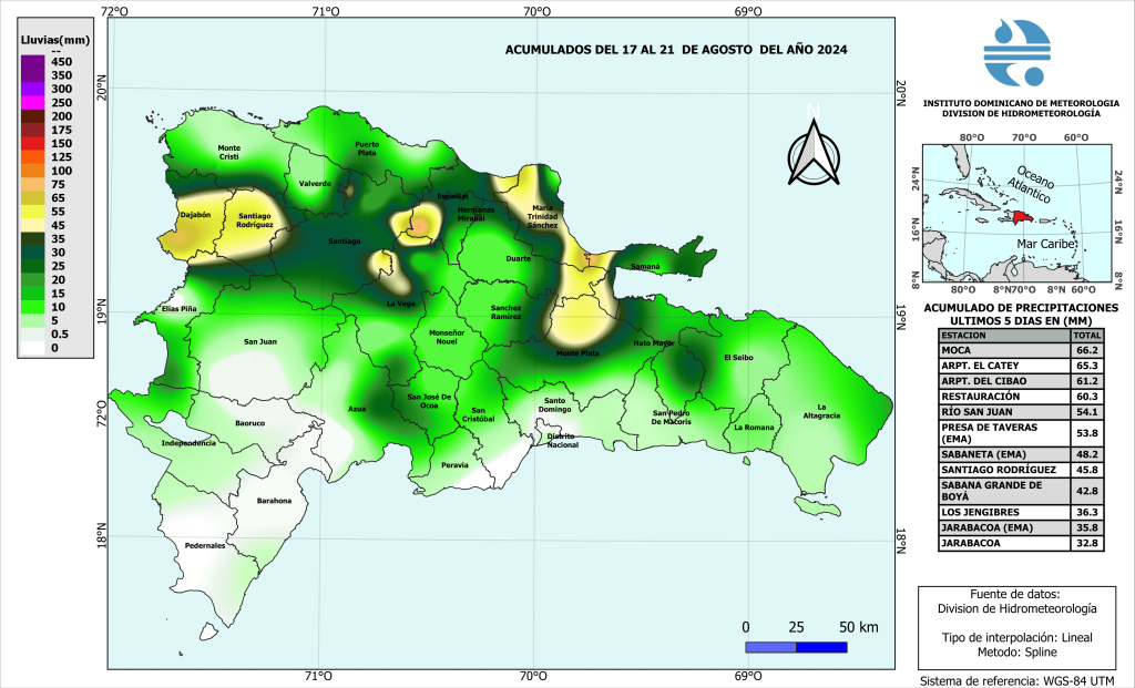 La mayor cantidad de lluvias registrada en esos cinco días fue en Moca con 66.2 milímetros, en Santiago con 61.2 milímetros y en Restauración (Dajabón) con 60.3 milímetros.
