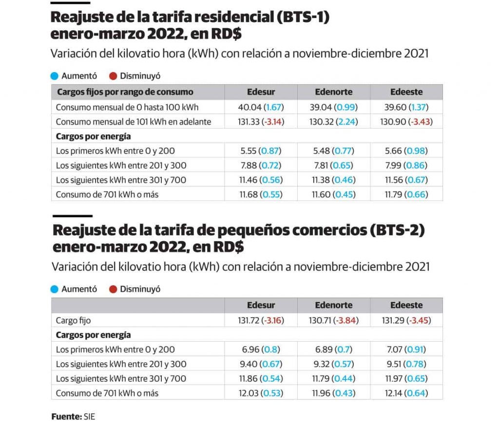 Los clientes de las tres empresas distribuidoras de electricidad (EDE) comenzaron a ver reflejado en su factura por el consumo de diciembre los precios del kilovatio hora (kWh) que regirá para el trimestre enero-marzo de 2022, a pesar de solo haber consumidos tres días del nuevo año y de la nueva tarifa eléctrica, establecida por la Superintendencia de Electricidad (SIE).