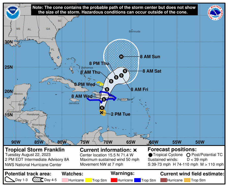 Franklin se ubica a las 2:00 de la tarde de este martes a 375 kilómetros al sur-suroeste de Santo Domingo y tiene vientos máximos de 85 kilómetros por hora, de acuerdo al más reciente boletín del Centro Nacional de Huracanes de Estados Unidos. Se mueve hacia el noroeste a 11 kilómetros por hora.