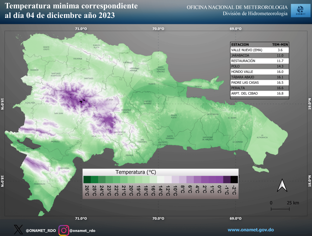 En Valle Nuevo el pasado martes hubo una mínima de 1.8 °C; el miércoles, 2.0 °C; el jueves, 6.9 °C; el sábado 2 de diciembre, 8.8 °C y este lunes, 3.6 °C.