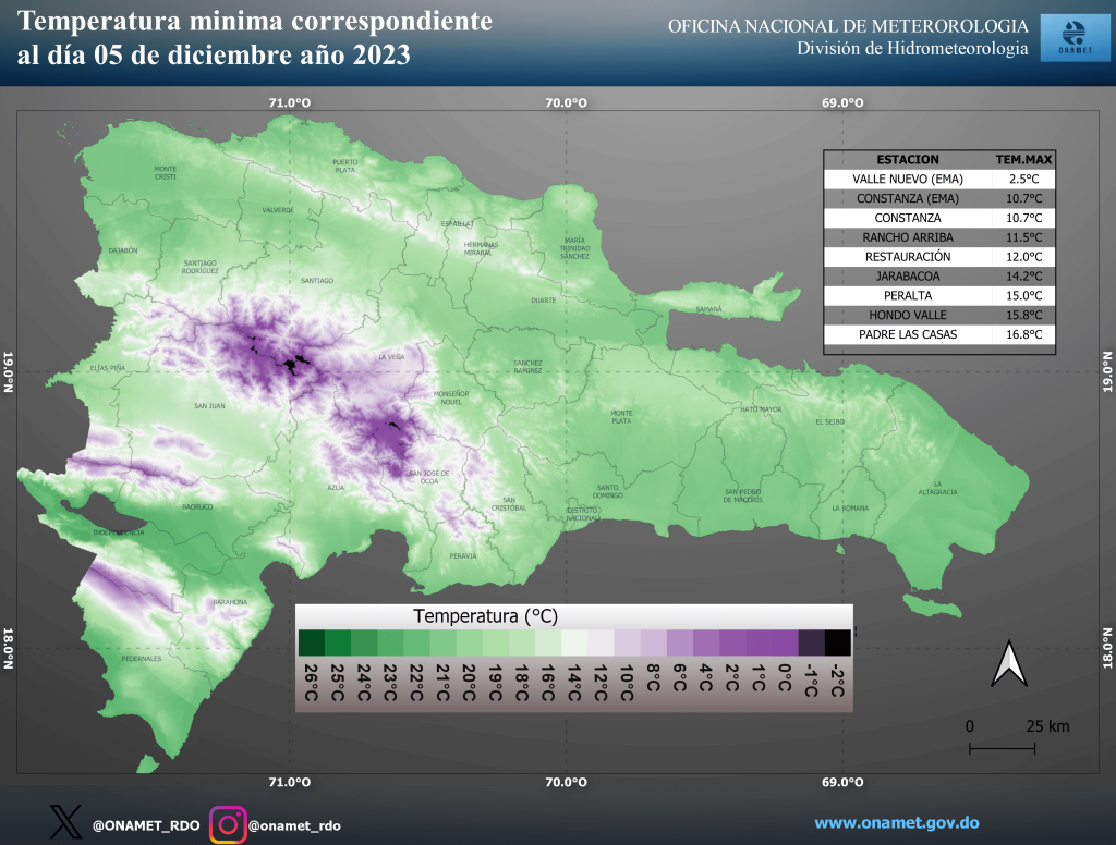 El pasado martes en Valle Nuevo hubo una mínima de 2.5 °C; en Constanza, 10.7 °C; Rancho Arriba (San José de Ocoa), 11.5 °C; y en Restauración (Dajabón), 12.0 °C.