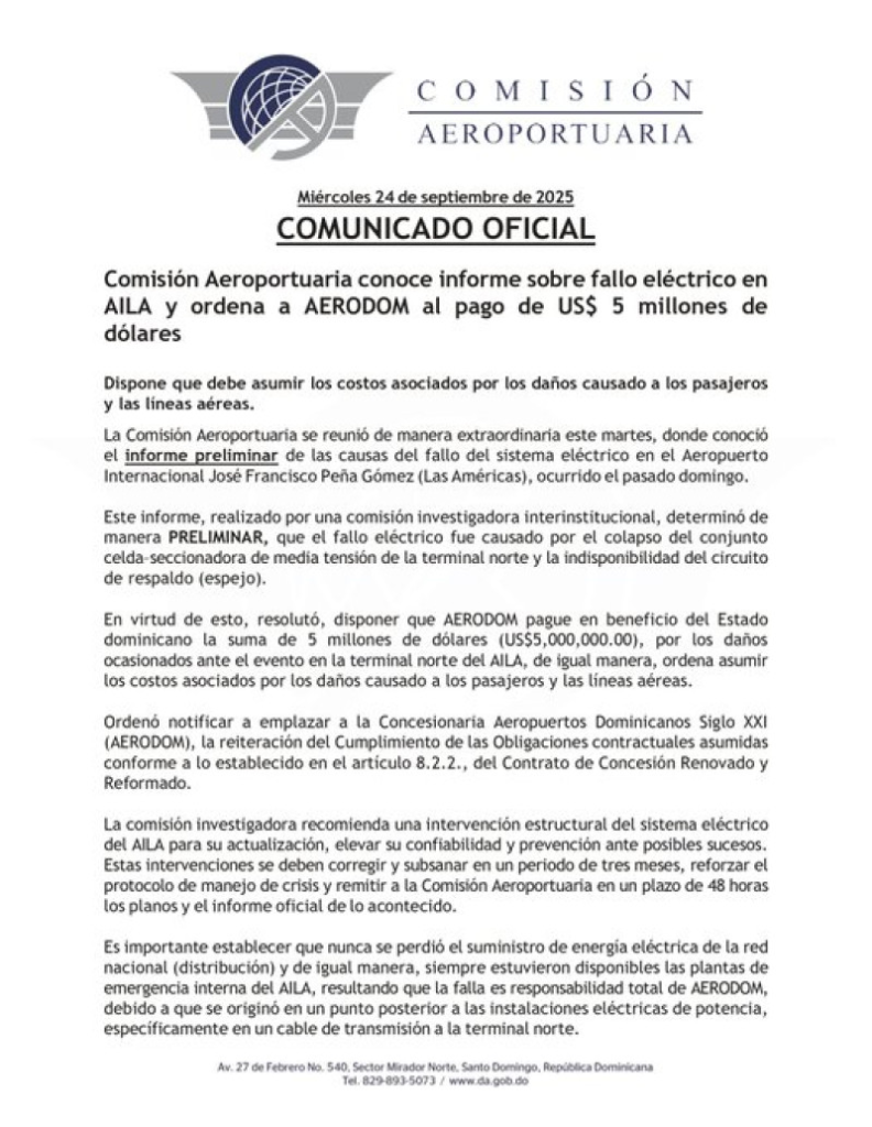 También ordenó a Aerodom asumir los costos asociados por los daños causados a los pasajeros y las líneas aéreas durante las casi nueve horas que duró el apagón.