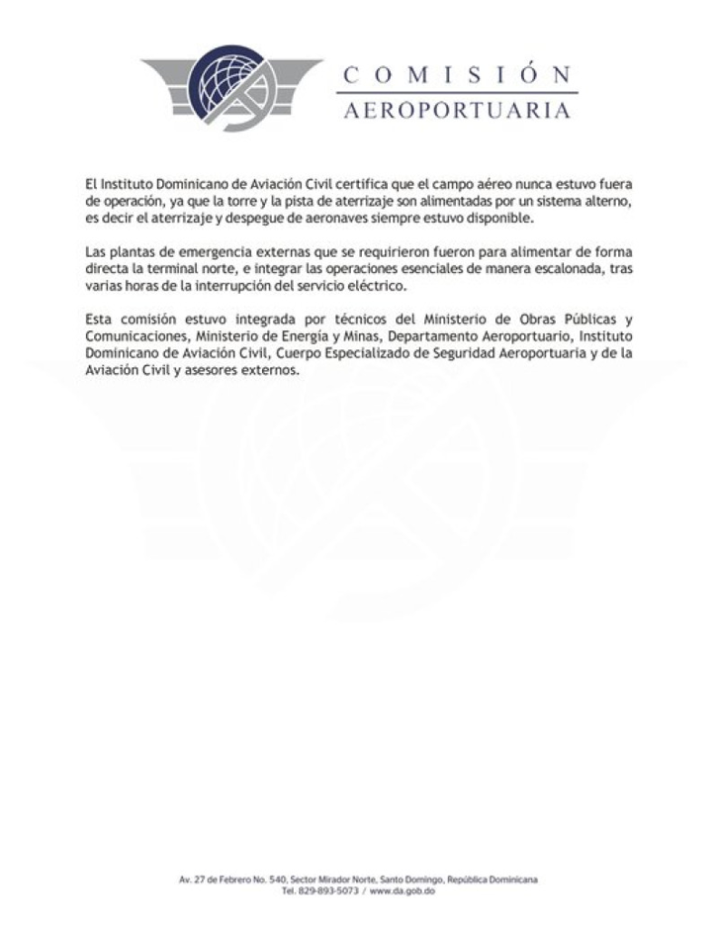 Según el comunicado, el Instituto Dominicano de Aviación Civil certificó que el campo aéreo nunca estuvo fuera de operación, ya que la torre y la pista de aterrizaje son alimentadas por un sistema alterno.