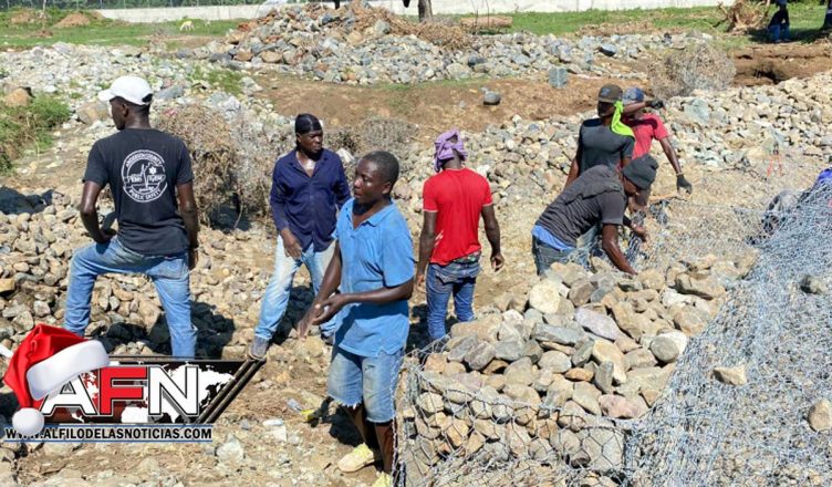 Decenas de los haitianos estuvieron la tarde de este jueves reparando los muros gaviones afectados por la fuerte creciente del afluente.