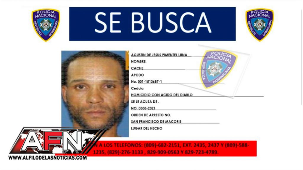 SANTO DOMINGO.- Las autoridades policiales identificaron como Agustín de Jesús Pimentel Luna, alias Caché, al hombre que presuntamente le roció ‘ácido del diablo’ a la ahora fallecida Yanelis Arias López, en un hecho ocurrido en Tenares, provincia Hermanas Mirabal.