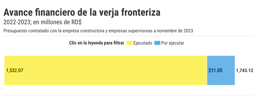 • Montecristi y Dajabón: trabajos terminados en muros de hormigón en una longitud de 23,500 metros, instalación de verja metálica en 4,000 metros, instalación de malla ciclónica en 7,000 metros, trabajos de suministro y colocación de material de relleno en 25,485 metros de caminos, 5 torres de vigilancia terminadas y 7 torres de vigilancia en construcción.