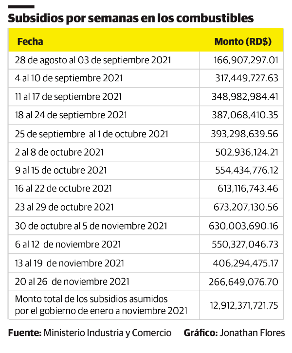 Hasta el pasado mes de octubre el Gobierno, a través del Ministerio de Industria y Comercio (MIC), había destinado 12,912.4 millones de pesos en los subsidios que asume semanalmente para evitar que los precios de los combustibles lleguen más caros a los consumidores, al tiempo que se han ido desmontando las exenciones fiscales que se dan a las grandes empresas y a las generadoras eléctricas.