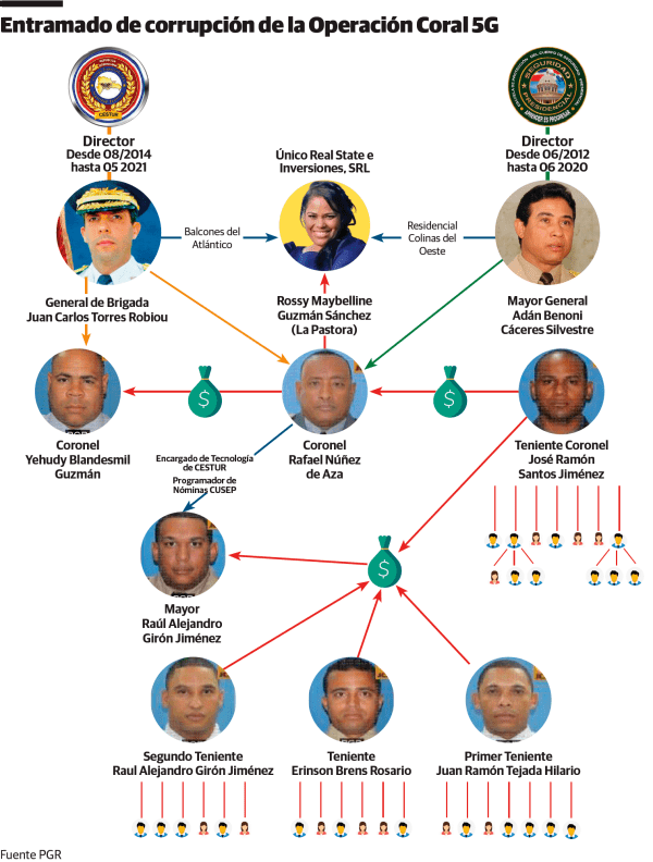 El primero, el mayor José Manuel Rosario Pirón es identificado por la Pepca como la mano derecha del director financiero del Cestur y Cusep, Rafael Núñez de Aza y cuya función principal era lavar el dinero producto de la corrupción.