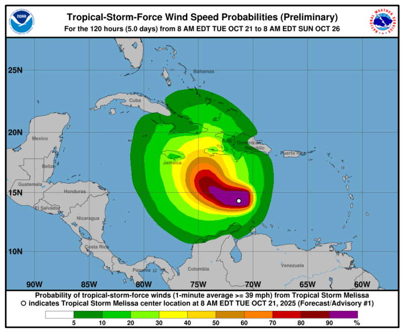 Melissa se encuentra actualmente unos 480 kilómetros al sur de Puerto Príncipe, con vientos máximos sostenidos de 85 kilómetros por hora y se espera que pueda convertirse en huracán durante el fin de semana.