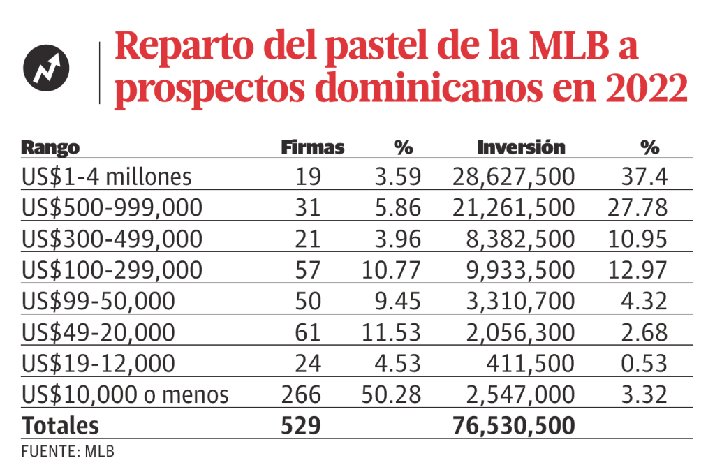 En 2022, cuando se suma lo entregado a los quisqueyanos del patio y nacido en el exterior, pero firmados aquí, llegó hasta los US$76.5 millones para 529 jugadores.
