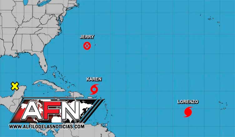 Miami.- Mientras el huracán Lorenzo alcanzó ya la categoría 3 con vientos de 125 millas por hora (205 km/h) sobre mar abierto, la debilitada tormenta tropical Karen se mueve hacia el nornoreste, sin que se conozca con exactitud a qué territorios afectará después de un giro hacia el suroeste este fin de semana.
