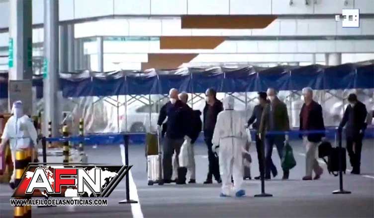Imágenes retransmitidas por la cadena estatal CGTN mostraron hoy la llegada de los miembros del equipo al aeropuerto de la ciudad procedentes de Singapur y su recibimiento por parte de personal enfundado en trajes blancos de protección.