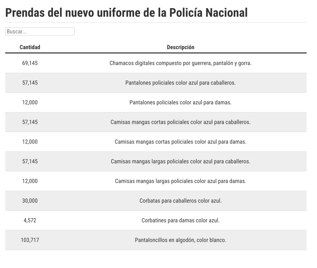 Para este cambio de imagen, la institución adquirió un total de 69,145 conjuntos digitales (compuestos por guerrera, pantalón y gorra); pantalones policiales para caballeros y damas, distribuidos en una proporción de 57,145 y 12,000, respectivamente; y camisas policiales (de mangas cortas y largas) en la misma proporción para ambos sexos.