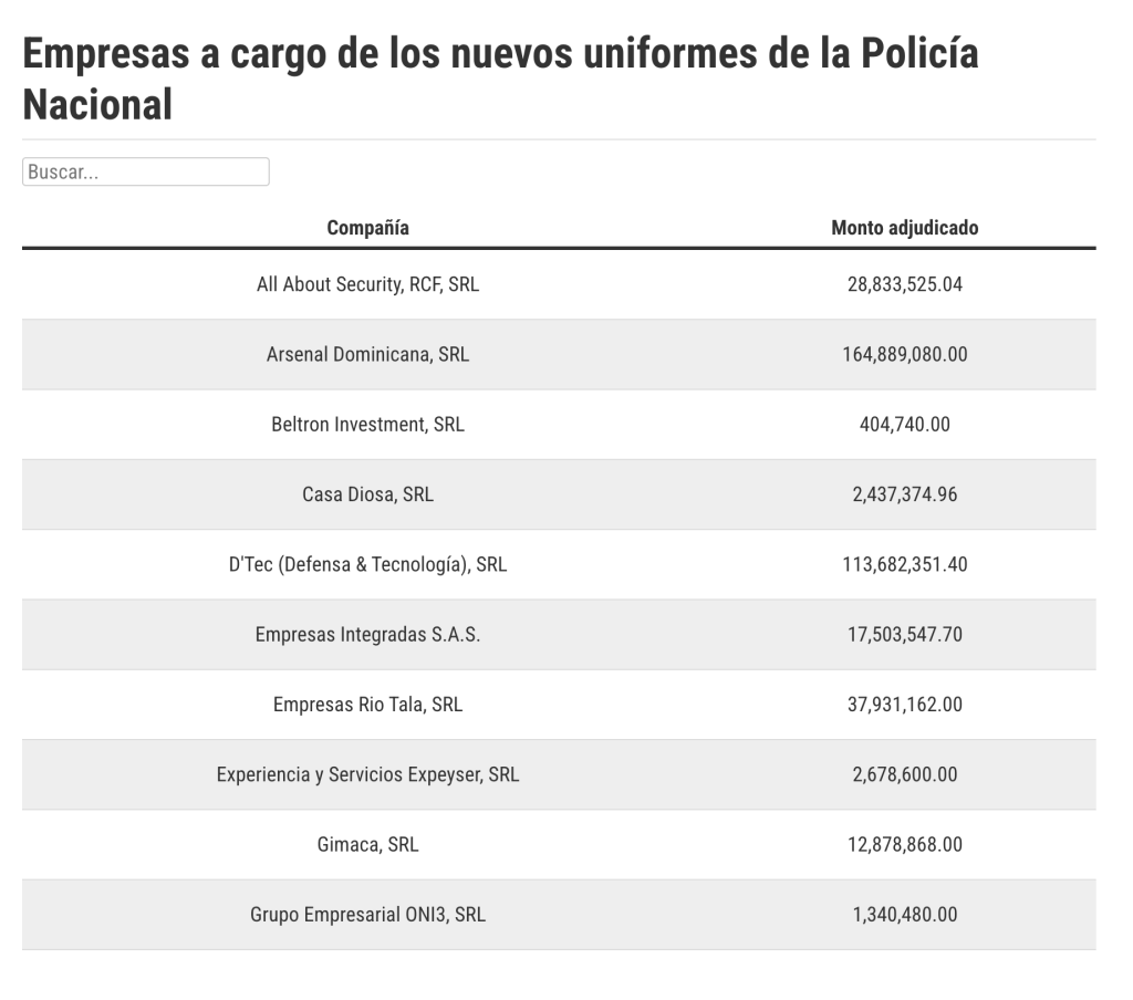 El proceso de licitación POLICÍA NACIONAL-CCC-LPN-2023-0004 fue publicado en dos periódicos nacionales los días 24 y 25 de agosto de 2023 y concluyó el 20 de octubre con la adjudicación del contrato a 23 empresas.