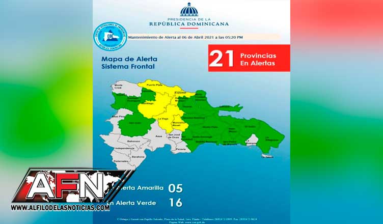 Mientras que en alerta verde están: Dajabón, San Pedro de Macorís, Monte Plata, Duarte, Samaná, San Juan, Hato Mayor, Valverde, San Cristóbal, María Trinidad Sánchez, La Altagracia, Santiago Rodríguez, El Seibo, Sánchez Ramírez, Hermanas Mirabal y el Gran Santo Domingo.