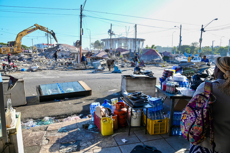 En el lugar se mantienen maquinarias removiendo las casetas de blocks acompañadas de brigadas que se encuentran recogiendo los desechos.