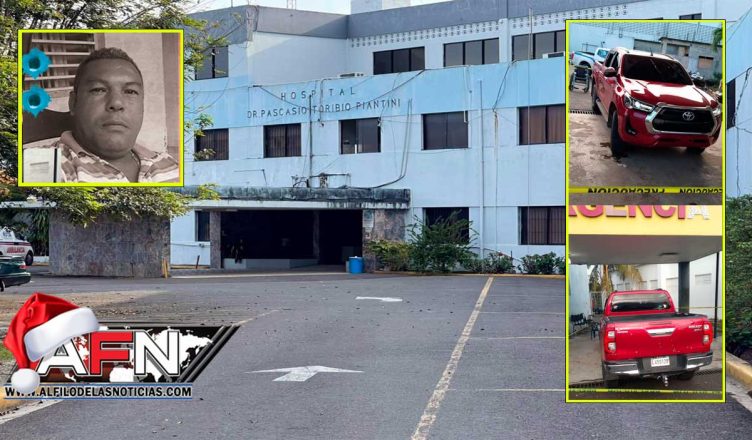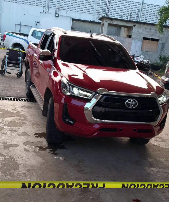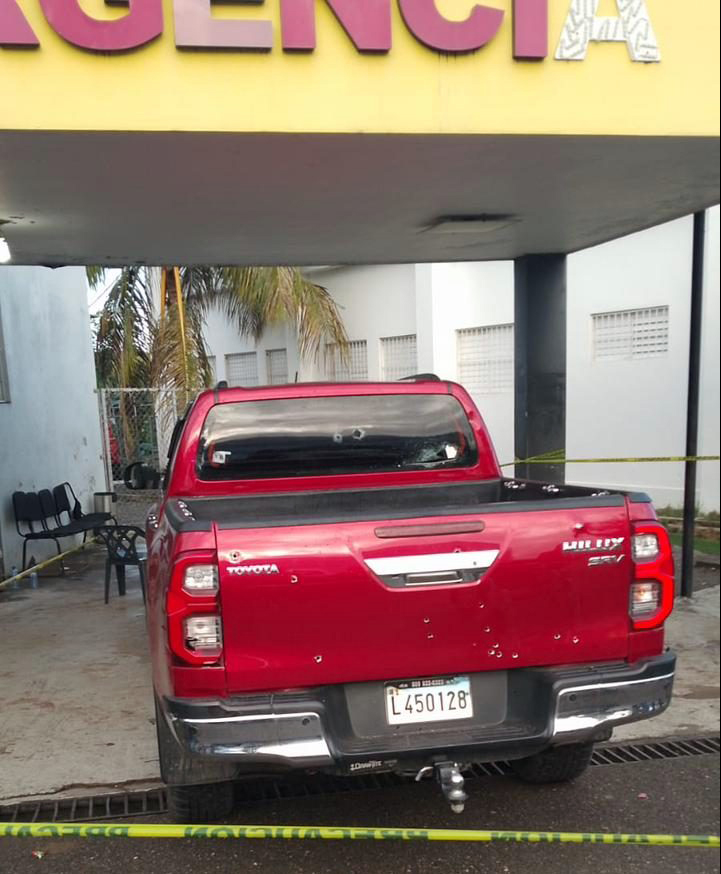 El vehículo en que se desplazaban los individuos una camioneta marca Toyota Hilux color Rojo, se encuentra parqueada en el área de emergencia del Hospital Dr. Pascasio Toribio Piantini con varios impactos de bala.