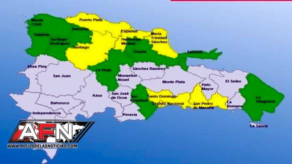 En tanto, que en verde figuran diez: San Cristóbal, Hermanas Mirabal, La Vega, Duarte, Montecristi, Dajabón, Santiago Rodríguez, Samaná, Valverde y La Altagracia.