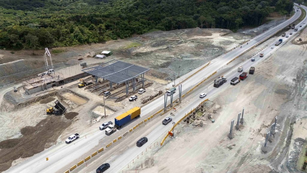 En la actualidad, dos de los seis carriles del tramo son utilizados para la intervención. Se continúa en el movimiento de tierra del entorno y ya se instalan las vigas que sustentarán la estructura que cubrirá el sistema de cobro.
