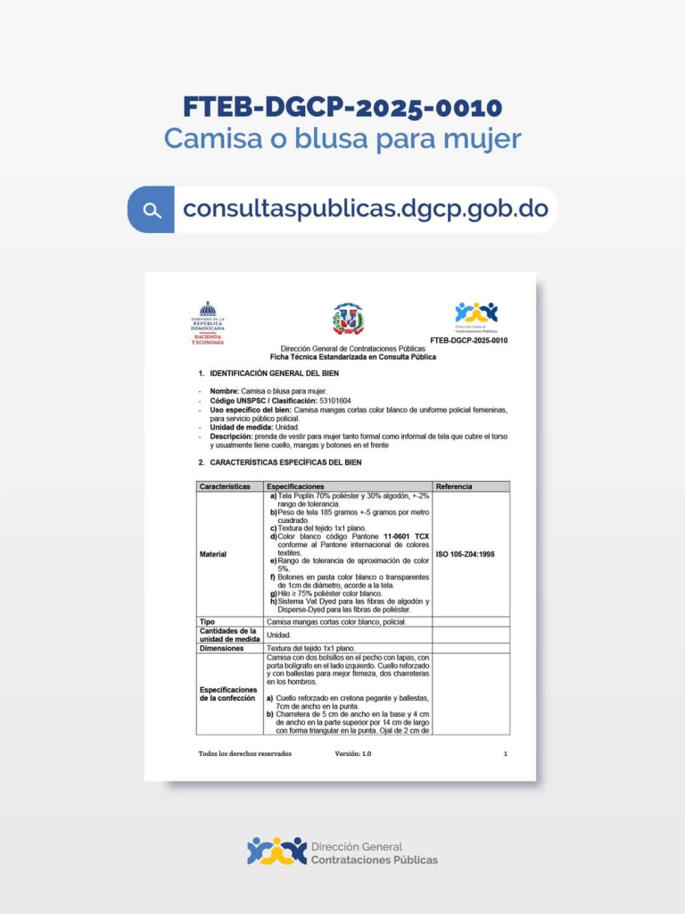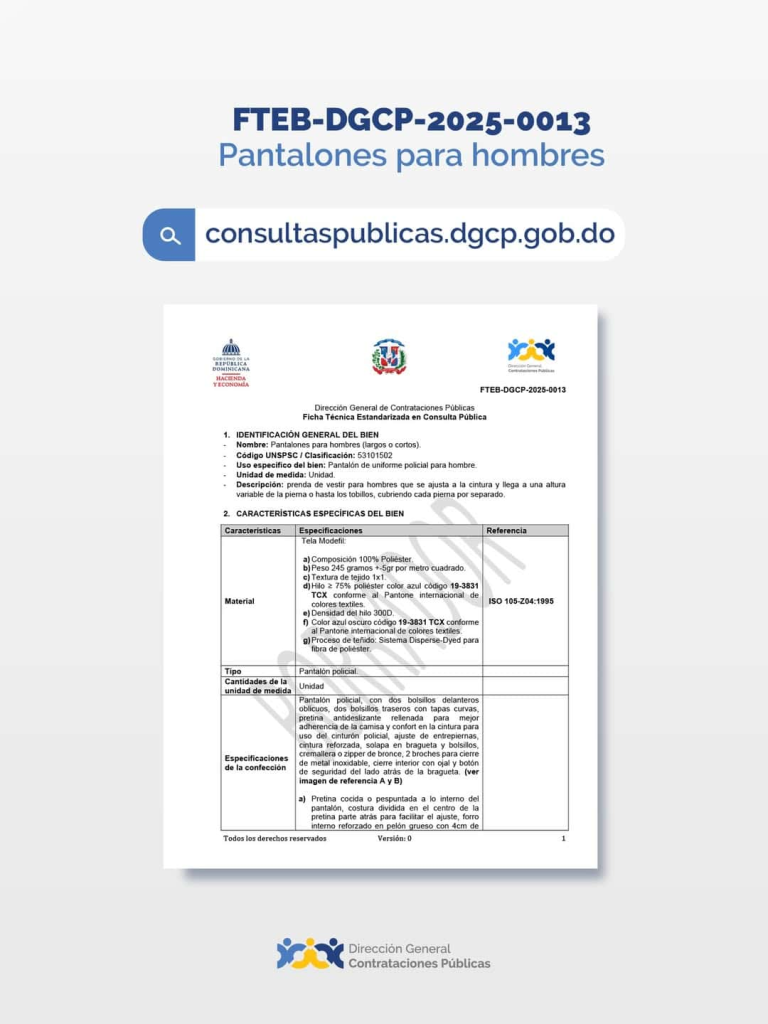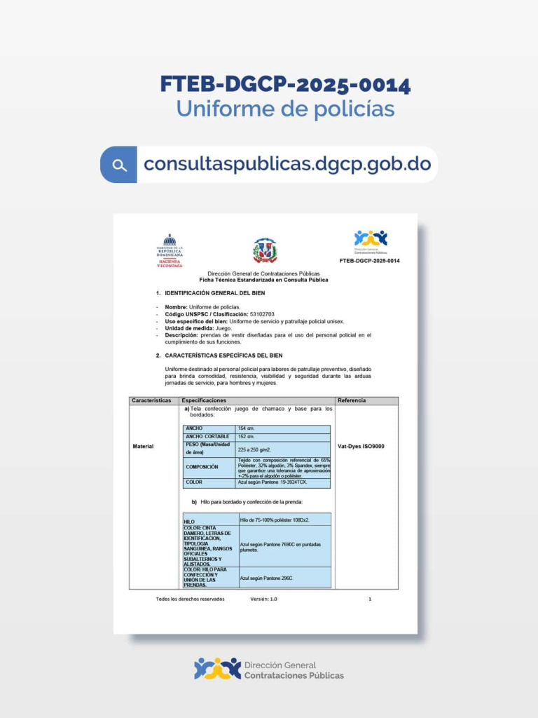 SANTO DOMINGO.- La Dirección General de Contrataciones Públicas (DGCP) colocó en consulta pública cinco fichas técnicas, identificadas bajo los procesos FTEB-DGCP-2025 del 0010 al 0014, para la adquisición de uniformes policiales, diferenciado por tipo de prenda y género.