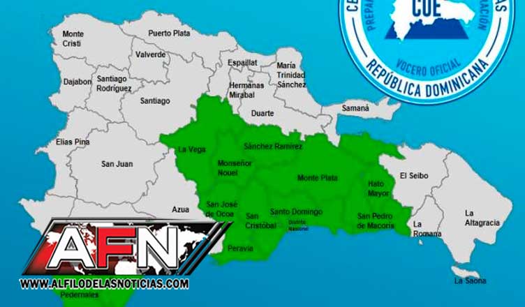Las provincias en alerta son San Pedro de Macorís, La Vega, San Cristóbal, Monte Plata, Monseñor Nouel, San José de Ocoa, Hato Mayor, Sánchez Ramírez, Pedernales, Barahona y Santo Domingo.