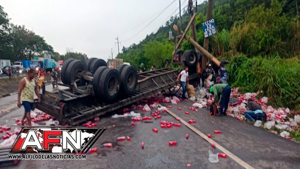 SANTO DOMINGO.- Una patana cargada de refrescos y jugos perdió el control y se volcó la mañana de este martes en el kilometro 14 de la autopista Duarte.