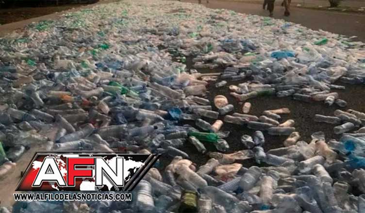Varias personas utilizando equipos de grabación, un dron, entre otros instrumentos tecnológicos, se observaban en el lugar tomando impresiones de las botellas que cubrían casi un kilómetro de distancia de dicha vía.