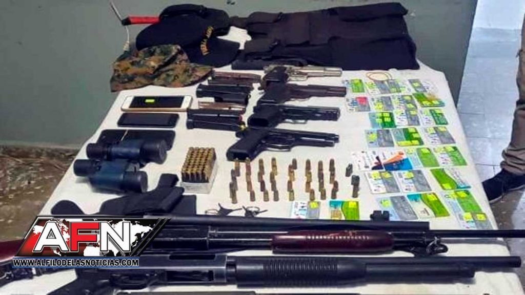 De igual manera, fue ocupado un cañón de escopeta de calibre 12 milímetros, dos cargadores de pistola, dos chalecos antibalas, 76 cápsulas calibre 9 milímetros, seis cápsulas calibre 38 milímetros, dos cápsulas de salva, un grillete, una piernera para pistola, tres cananas de cintura para portar pistolas, una sobaquera de pistola, una macana extensible de hierro, unos binoculares, un machete y dos gorras con las letras de dos organismos militares del país.