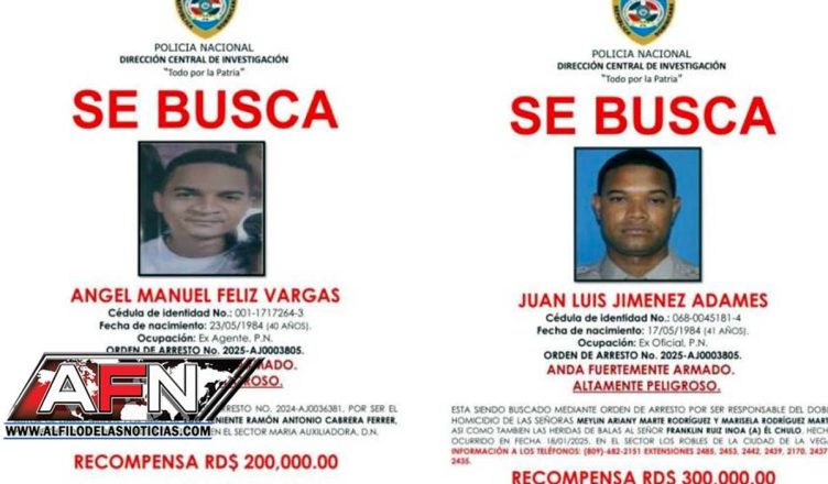 SANTO DOMINGO.- La Policía Nacional anunció este miércoles recompensas de 300,000 pesos y 200,000 pesos para quienes aporten información que permitan la captura de Juan Luis Jiménez Adames y Ángel Manuel Feliz Vargas, respectivamente, ambos exmiembros de la institución implicados en hechos criminales graves.