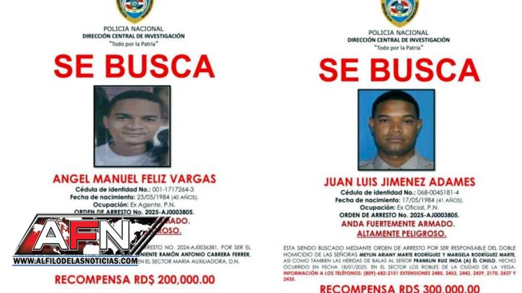 SANTO DOMINGO.- La Policía Nacional anunció este miércoles recompensas de 300,000 pesos y 200,000 pesos para quienes aporten información que permitan la captura de Juan Luis Jiménez Adames y Ángel Manuel Feliz Vargas, respectivamente, ambos exmiembros de la institución implicados en hechos criminales graves.
