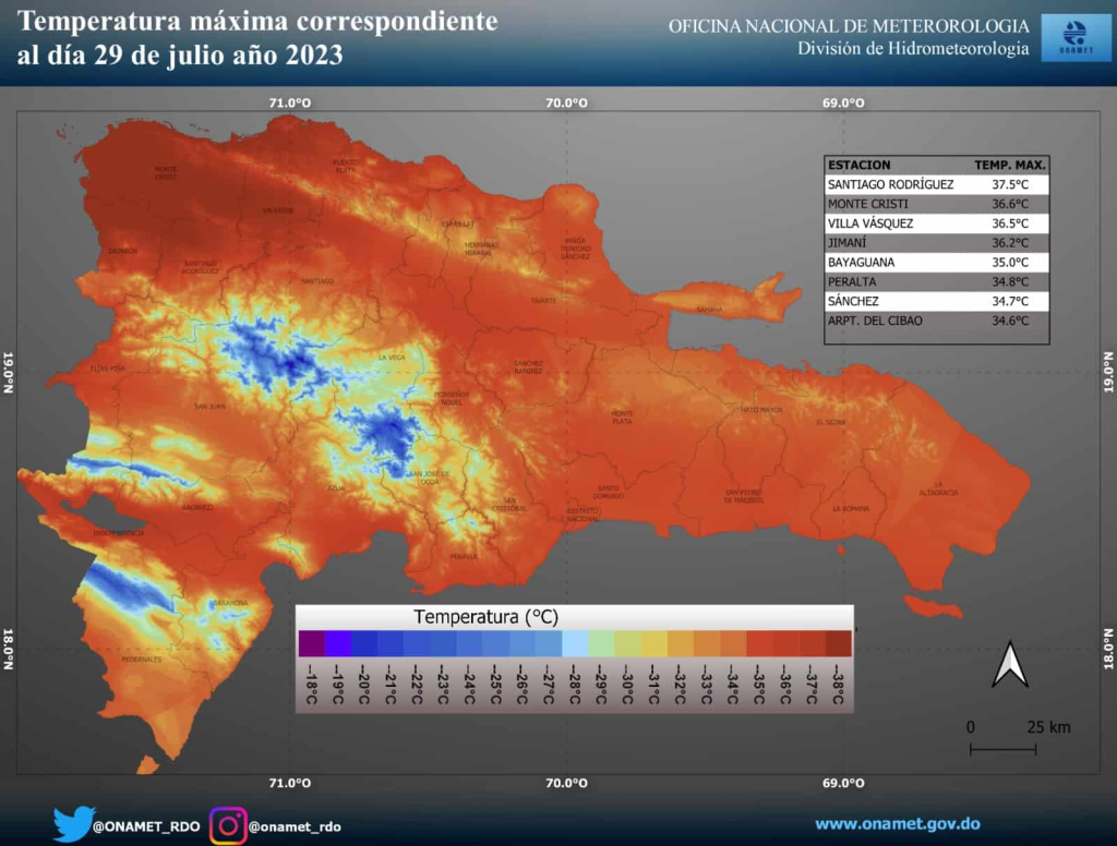 El pasado sábado la máxima temperatura que se registró en el país fue en la provincia Santiago Rodríguez con 37.5 °C, en tanto que Montecristi registró 36.6 °C, el municipio Villa Vásquez 36.5 °C y Jimaní, 36.2 °C.