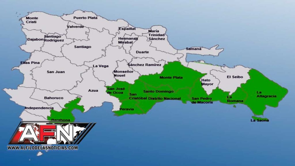 Las provincias en alerta son Monte Plata, La Altagracia, Distrito Nacional, Barahona, Peravia, La Romana, San Cristóbal, San Pedro de Macorís, Santo Domingo y San José de Ocoa.