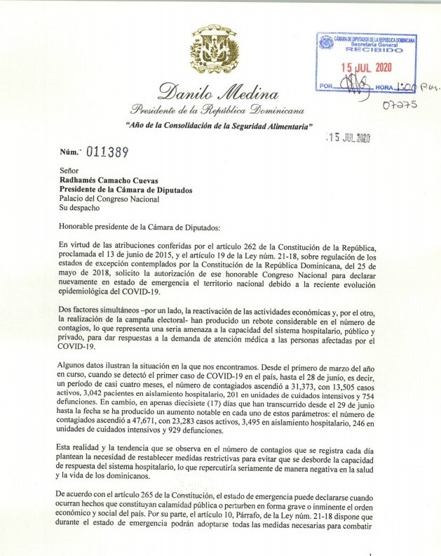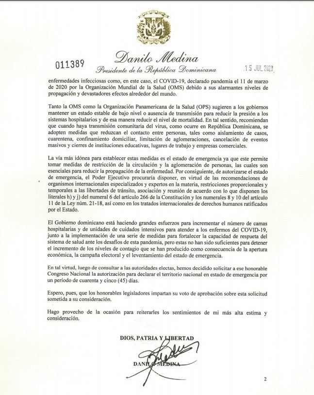 SANTO DOMINGO.- El presidente de la República, Danilo Medina solicitó este miércoles al Congreso Nacional aprobar un nuevo estado de emergencia por 45 días, debido al desbordamiento del coronavirus en el país.